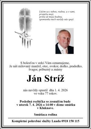 Oznamujeme občanom obce, že nás navždy opustil náš spoluobčan Ján Stríž, bytom Kluknava č. d. 94, vo veku 77 rokov. Posledná rozlúčka so zosnulým sa uskutoční dňa 7. apríla 2026 o 14:00 hod. v Dome smútku v Kluknave.