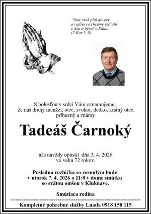 Oznamujeme občanom obce, že zomrel náš spoluobčan Tadeáš Čarnoký vo veku 72 rokov. Posledná rozlúčka so zosnulým bude 7.4.2026 o 11:00 hod. v dome smútku so svätou omšou.